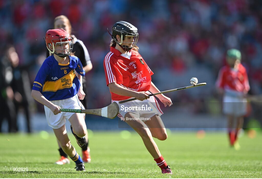 17 August 2014; Tara Bermingham Nolan, Drumphea National School, Carlow, representing Cork, in action against Meaghan Clarke, Lady of Lourdes Primary School, Tyrone, representing Tipperary. INTO/RESPECT Exhibition GoGames, Croke Park, Dublin. Picture credit: Brendan Moran / SPORTSFILE