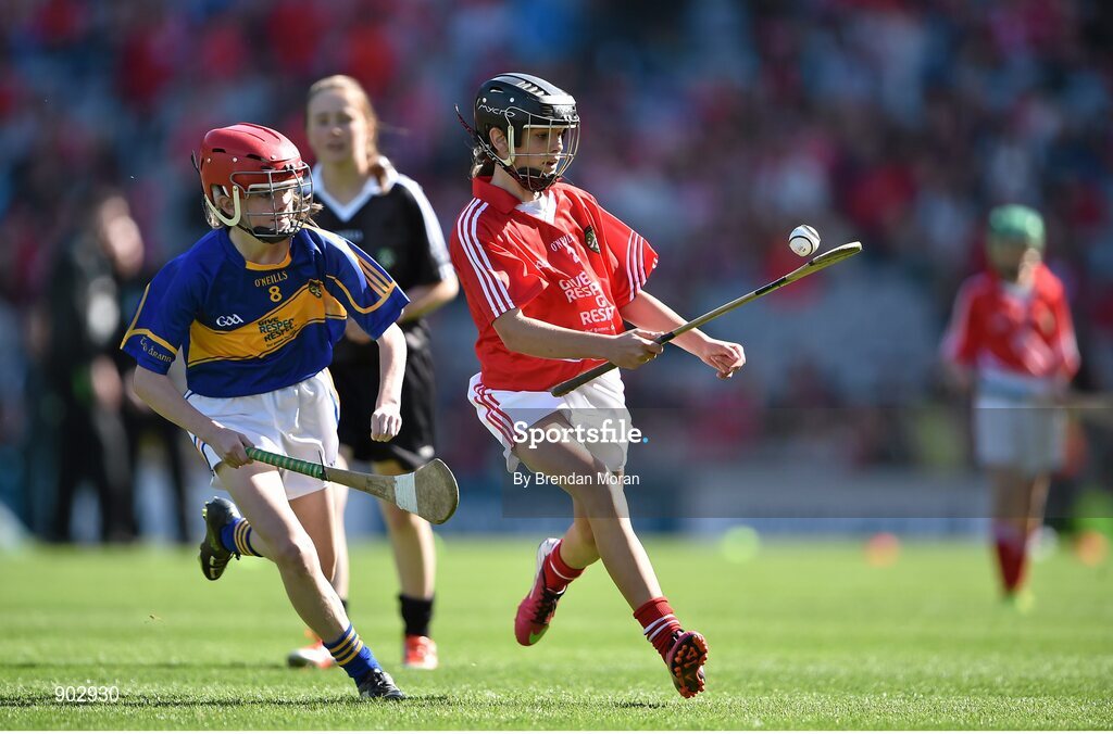 17 August 2014; Tara Bermingham Nolan, Drumphea National School, Carlow, representing Cork, in action against Meaghan Clarke, Lady of Lourdes Primary School, Tyrone, representing Tipperary. INTO/RESPECT Exhibition GoGames, Croke Park, Dublin. Picture credit: Brendan Moran / SPORTSFILE