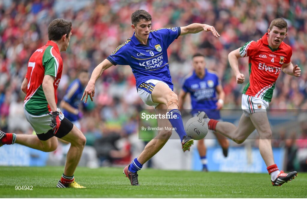 24 August 2014; Mark O'Connor, Kerry, in action against Sean Conlon, left, and Eoin O Donoghue, Mayo. Electric Ireland GAA Football All Ireland Minor Championship, Semi-Final, Kerry v Mayo, Croke Park, Dublin. Picture credit: Brendan Moran / SPORTSFILE
