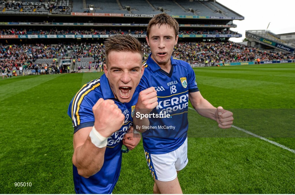 24 August 2014; Micheal Burns, left, and Liam Carey, Kerry, celebrate their victory. Electric Ireland GAA Football All-Ireland Minor Championship, Semi-Final, Kerry v Mayo, Croke Park, Dublin. Picture credit: Stephen McCarthy / SPORTSFILE