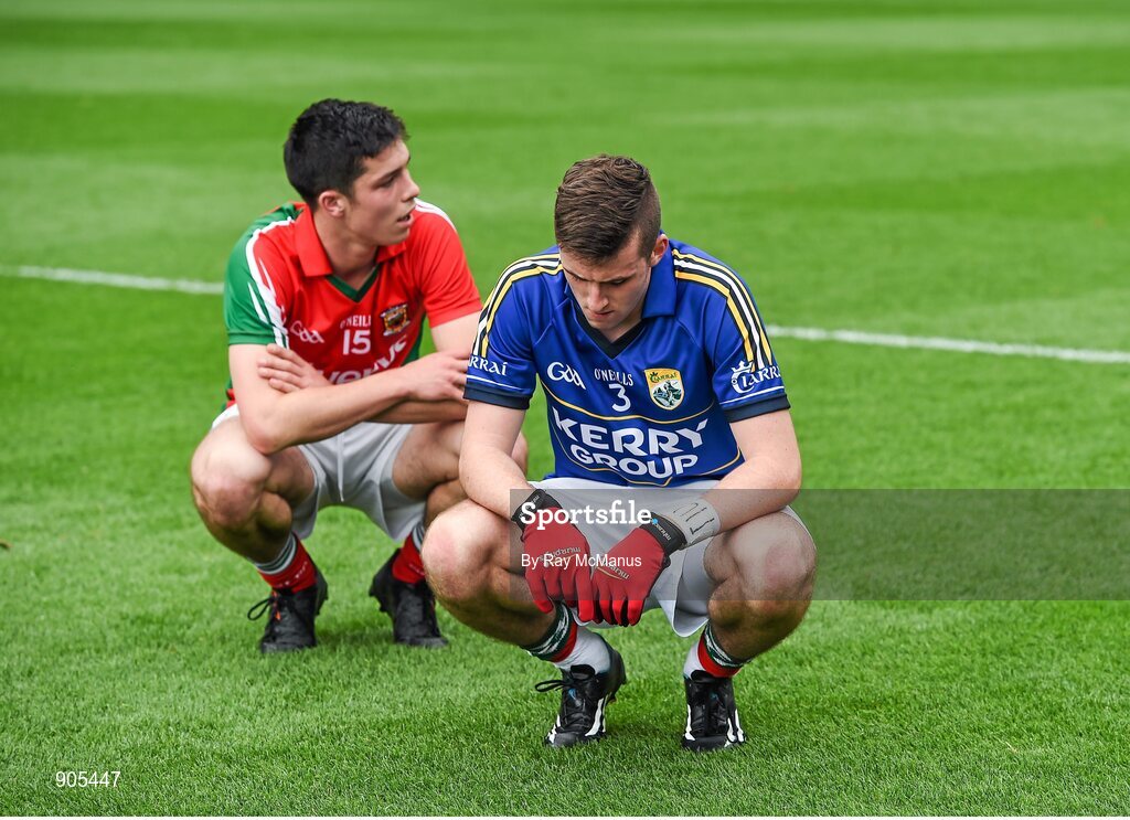24 August 2014; Liam Byrne, wearing a Kerry jersey, and his Mayo team mate Brian Reape after the game. Electric Ireland GAA Football All-Ireland Minor Championship, Semi-Final, Kerry v Mayo, Croke Park, Dublin. Picture credit: Ray McManus / SPORTSFILE
