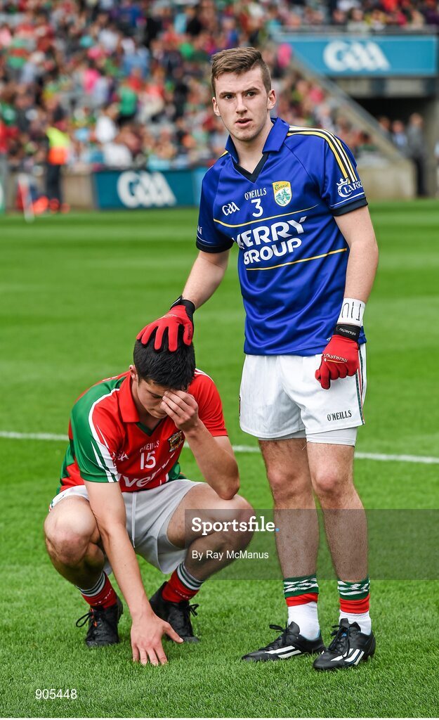 24 August 2014; Liam Byrne, wearing a Kerry jersey, comforts his Mayo team mate Brian Reape after the game. Electric Ireland GAA Football All-Ireland Minor Championship, Semi-Final, Kerry v Mayo, Croke Park, Dublin. Picture credit: Ray McManus / SPORTSFILE
