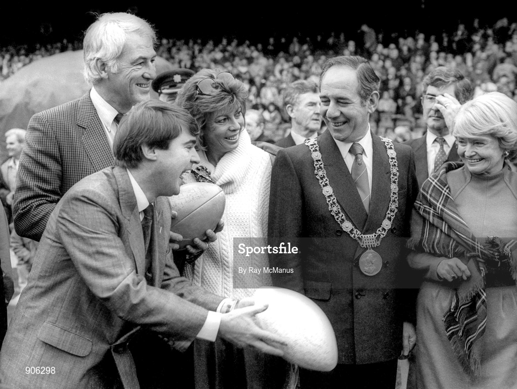 19 November 1988; Dignitaries on the pitch before the game, right to left, US Ambassador to Ireland Margaret Heckler, Lord Mayor of Dublin Ben Briscoe, Norma Smurfit, and Minister of State for Youth and Sport Frank Fahey. Boston College v Army, Emerald Isle Classic, Lansdowne Road, Dublin. Picture credit: Ray McManus / SPORTSFILE