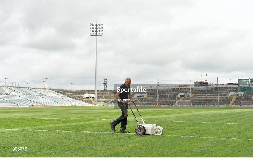 30 August 2014; Groundsman Nick Grene, marks out the thirteen metre line of the pitch ahead of the game. GAA Football All Ireland Senior Championship, Semi-Final Replay, Kerry v Mayo, Gaelic Grounds, Limerick. Picture credit: Barry Cregg / SPORTSFILE