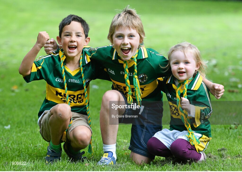 30 August 2014; Kerry supporters, from Duagh, Co. Kerry, left to right, Joey Maher, aged 6, nephew of Kerry player Anthony Maher and his cousins Michael Kelly, aged 8, and Lucy Kelly, aged 3. GAA Football All Ireland Senior Championship, Semi-Final Replay, Kerry v Mayo, Gaelic Grounds, Limerick. Picture credit: Dáire Brennan / SPORTSFILE