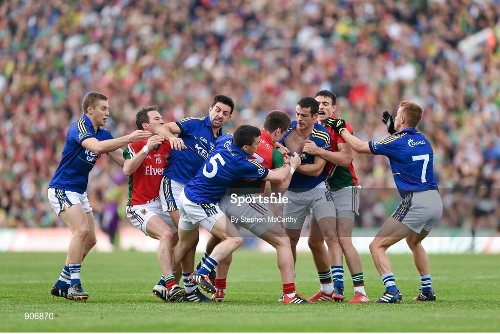 30 August 2014; Kerry players, from left, Peter Crowley, Aidan O'Mahony, Paul Murphy, Shane Enright and Fionn Fitzgerald tussle with Mayo's Alan Dillon, Cillian O'Connor and Jason Doherty. GAA Football All Ireland Senior Championship, Semi-Final Replay, Kerry v Mayo. Gaelic Grounds, Limerick. Picture credit: Stephen McCarthy / SPORTSFILE