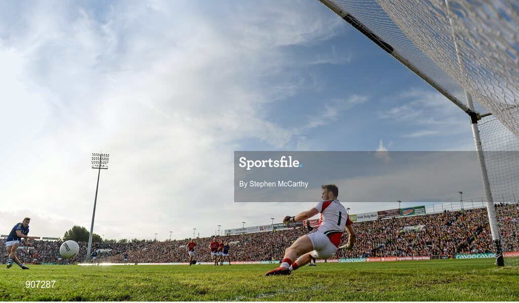 30 August 2014; James O'Donoghue, Kerry, shoots to score his side's second goal, from a penalty, past Mayo goalkeeper Rob Hennelly. GAA Football All Ireland Senior Championship, Semi-Final Replay, Kerry v Mayo. Gaelic Grounds, Limerick. Picture credit: Stephen McCarthy / SPORTSFILE