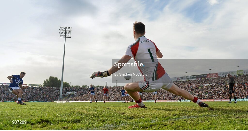 30 August 2014; James O'Donoghue, Kerry, shoots to score his side's third goal, from a penalty, past Mayo goalkeeper Rob Hennelly. GAA Football All Ireland Senior Championship, Semi-Final Replay, Kerry v Mayo. Gaelic Grounds, Limerick. Picture credit: Stephen McCarthy / SPORTSFILE