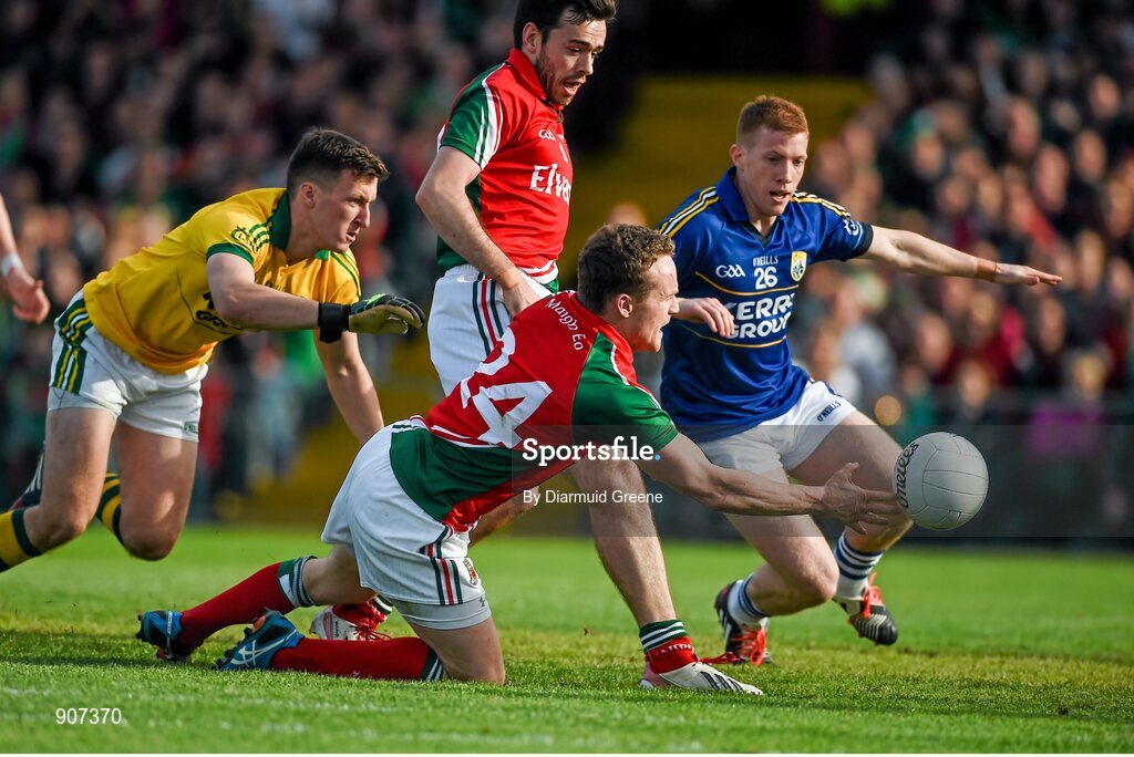 30 August 2014; Andy Moran, Mayo, scores his side's third goal despite the efforts of Kerry's Pa Kilkenny and goalkeeper Brian Kelly. GAA Football All Ireland Senior Championship, Semi-Final Replay, Kerry v Mayo. Gaelic Grounds, Limerick. Picture credit: Diarmuid Greene / SPORTSFILE