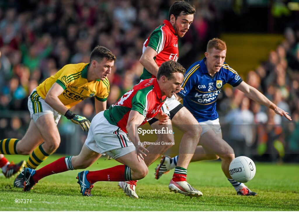 30 August 2014; Andy Moran, Mayo, scores his side's third goal despite the efforts of Kerry's Pa Kilkenny and goalkeeper Brian Kelly. GAA Football All Ireland Senior Championship, Semi-Final Replay, Kerry v Mayo. Gaelic Grounds, Limerick. Picture credit: Diarmuid Greene / SPORTSFILE
