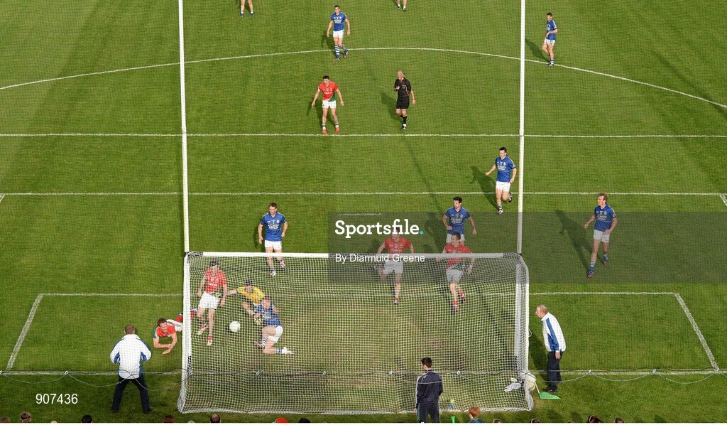 30 August 2014; Andy Moran, Mayo, scores his side's third goal despite the efforts of Kerry's Pa Kilkenny and goalkeeper Brian Kelly. GAA Football All Ireland Senior Championship, Semi-Final Replay, Kerry v Mayo. Gaelic Grounds, Limerick. Picture credit: Diarmuid Greene / SPORTSFILE
