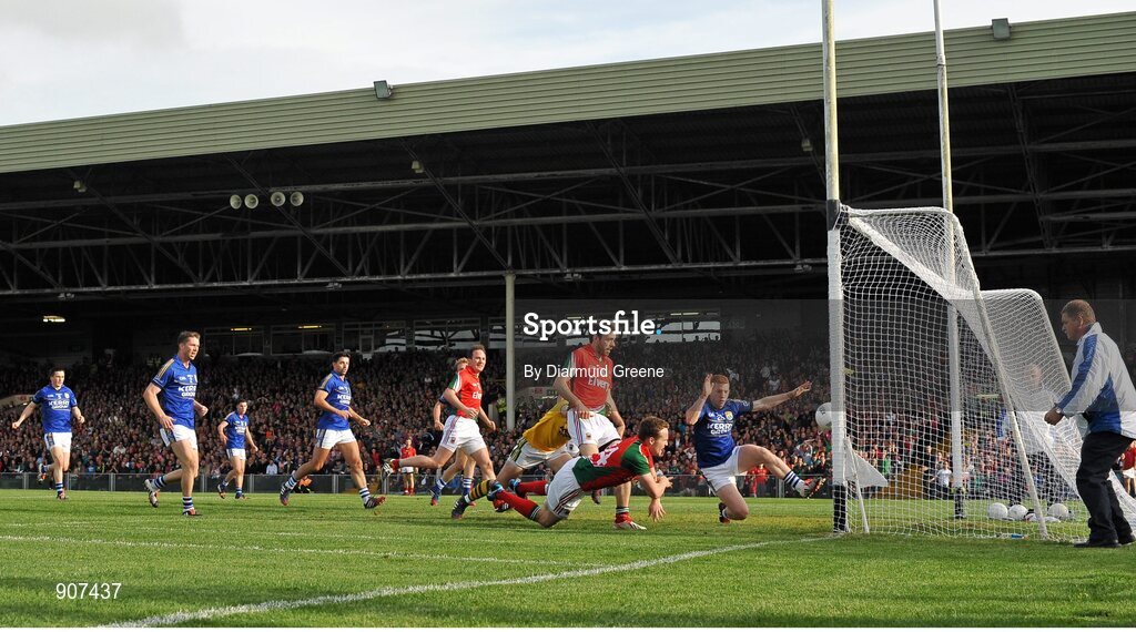 30 August 2014; Andy Moran, Mayo, scores his side's third goal despite the efforts of Kerry's Pa Kilkenny and goalkeeper Brian Kelly. GAA Football All Ireland Senior Championship, Semi-Final Replay, Kerry v Mayo. Gaelic Grounds, Limerick. Picture credit: Diarmuid Greene / SPORTSFILE