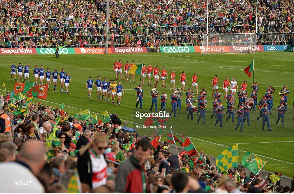 30 August 2014; The Kerry and Mayo teams parade behind the Artane School of Music Band before the game. GAA Football All Ireland Senior Championship, Semi-Final Replay, Kerry v Mayo. Gaelic Grounds, Limerick. Picture credit: Diarmuid Greene / SPORTSFILE