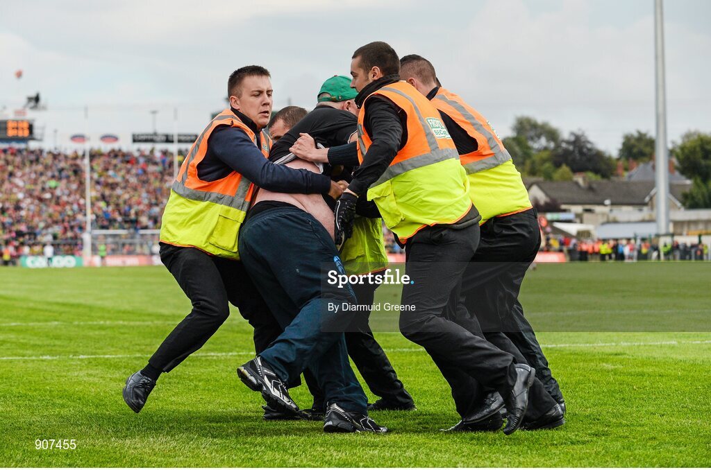 30 August 2014; A Mayo supporter is restrained by security staff after he tries to confront referee Cormac Reilly during the closing stages of the game. GAA Football All Ireland Senior Championship, Semi-Final Replay, Kerry v Mayo. Gaelic Grounds, Limerick. Picture credit: Diarmuid Greene / SPORTSFILE