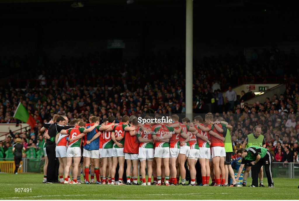 30 August 2014; The Mayo team gather together in a huddle at half-time of extra time. GAA Football All Ireland Senior Championship, Semi-Final Replay, Kerry v Mayo. Gaelic Grounds, Limerick. Picture credit: Diarmuid Greene / SPORTSFILE