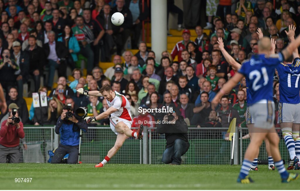 30 August 2014; Mayo goalkeeper Rob Hennelly takes a 45 metre free in the last seconds of normal time. It droppped short signalling extra time. GAA Football All Ireland Senior Championship, Semi-Final Replay, Kerry v Mayo. Gaelic Grounds, Limerick. Picture credit: Diarmuid Greene / SPORTSFILE