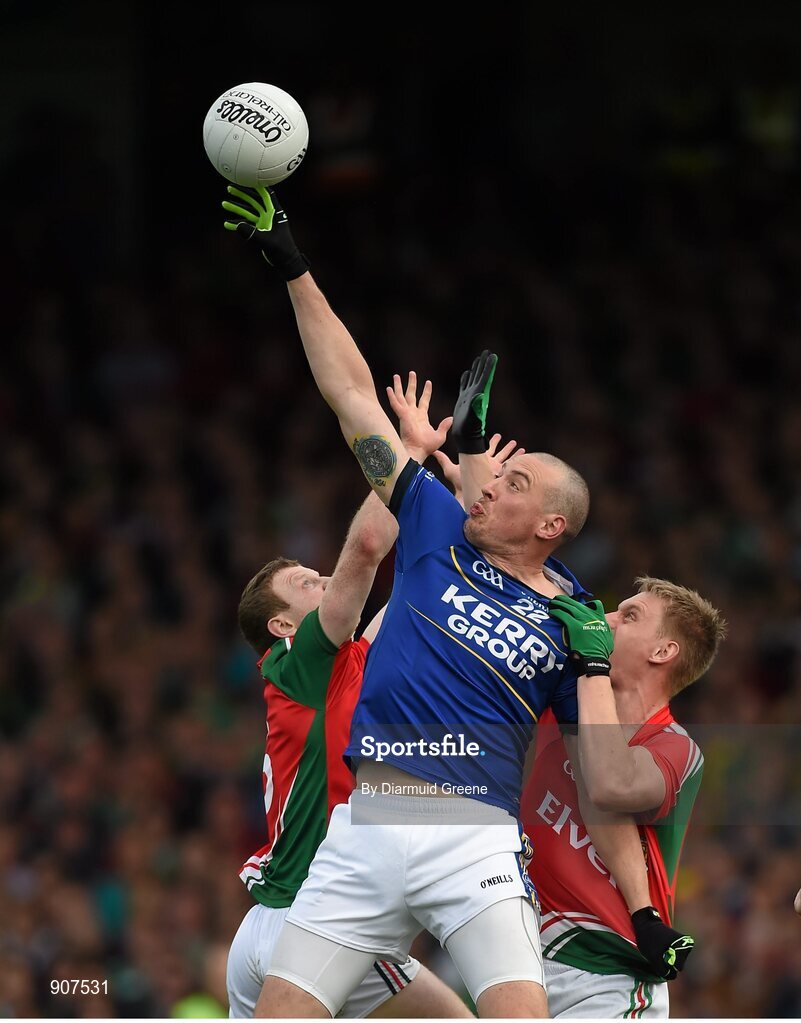 30 August 2014; Kieran Donaghy, Kerry, in action against Colm Boyle, left, and Kevin Keane, Mayo. GAA Football All Ireland Senior Championship, Semi-Final Replay, Kerry v Mayo. Gaelic Grounds, Limerick. Picture credit: Diarmuid Greene / SPORTSFILE