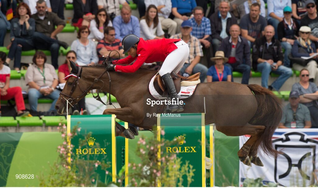 2 September 2014; Sameh El Dahan on Suma's Zorro competing during speed competition- first round of the Showjumping. 2014 Alltech FEI World Equestrian Games, Caen, France. Picture credit: Ray McManus / SPORTSFILE