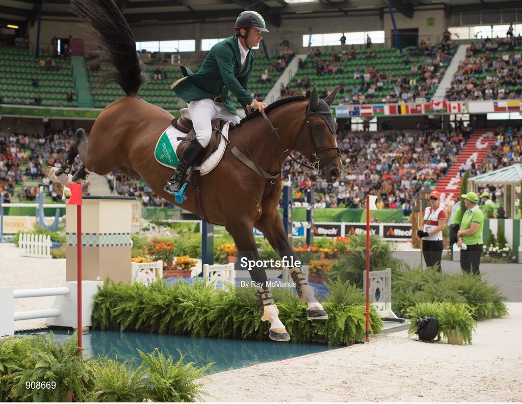 2 September 2014; Denis Lynch on All Star 5 jump the 'water' while competing during speed competition- first round of the Showjumping. 2014 Alltech FEI World Equestrian Games, Caen, France. Picture credit: Ray McManus / SPORTSFILE