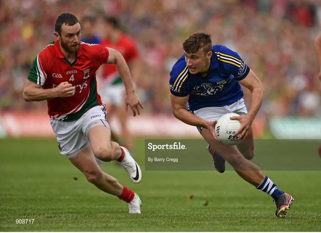 30 August 2014; James O'Donoughue, Kerry, in action against Keith Higgins, Mayo. GAA Football All Ireland Senior Championship, Semi-Final Replay, Kerry v Mayo, Gaelic Grounds, Limerick. Picture credit: Barry Cregg / SPORTSFILE
