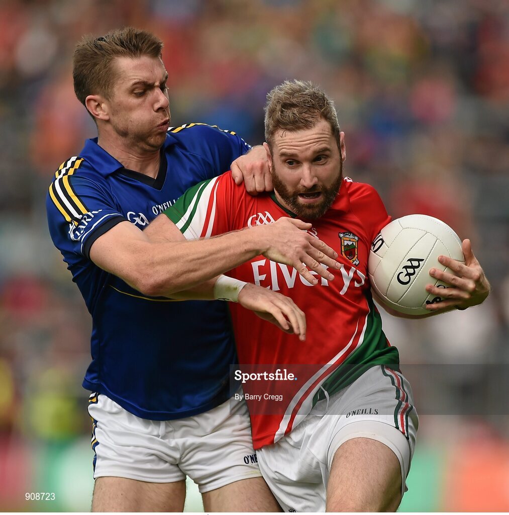 30 August 2014; Michael Conroy, Mayo, in action against Marc Ó Sé, Kerry. GAA Football All Ireland Senior Championship, Semi-Final Replay, Kerry v Mayo, Gaelic Grounds, Limerick. Picture credit: Barry Cregg / SPORTSFILE