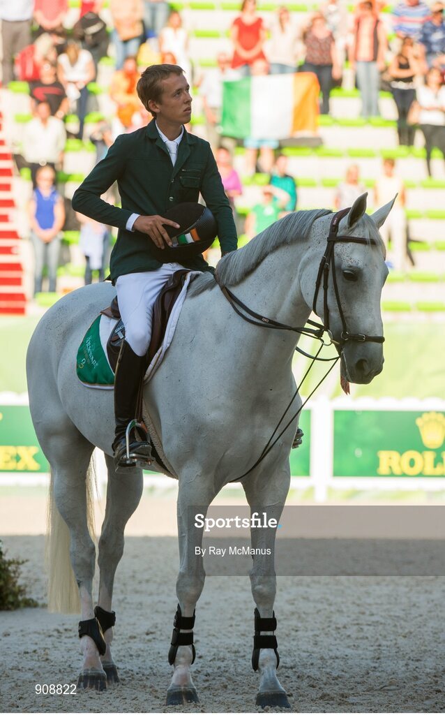 2 September 2014; Nineteen year old Bertram Allen, from Co. Wexford, who won the opening competition of The World Equestrian Games riding Molly Malone V stands to attention as the National Anthem "Amhrán na bhFiann" is played. 2014 Alltech FEI World Equestrian Games, Caen, France. Picture credit: Ray McManus / SPORTSFILE