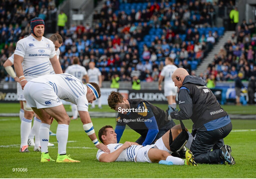 6 September 2014; Leinster's Noel Reid is attended to by Leinster medical personnel before having to leave the game with an injury. Guinness PRO12, Round 1, Glasgow Warriors v Leinster. Scotstoun Stadium, Glasgow, Scotland. Picture credit: Stephen McCarthy / SPORTSFILE