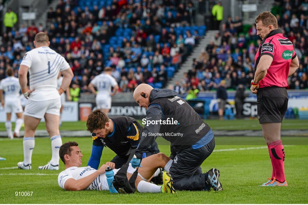 6 September 2014; Leinster's Noel Reid is attended to by Leinster medical personnel before having to leave the game with an injury. Guinness PRO12, Round 1, Glasgow Warriors v Leinster. Scotstoun Stadium, Glasgow, Scotland. Picture credit: Stephen McCarthy / SPORTSFILE