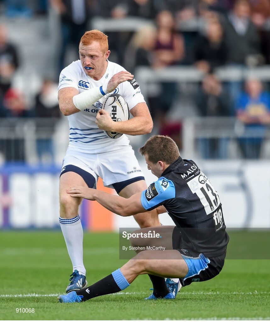 6 September 2014; Darragh Fanning, Leinster, is tackled by Mark Bennett, Glasgow Warriors. Guinness PRO12, Round 1, Glasgow Warriors v Leinster. Scotstoun Stadium, Glasgow, Scotland. Picture credit: Stephen McCarthy / SPORTSFILE
