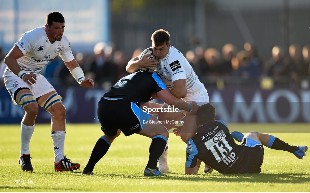 6 September 2014; Brendan Macken, Leinster, is tackled by Alex Allan, left, and Mark Bennett, Glasgow Warriors. Guinness PRO12, Round 1, Glasgow Warriors v Leinster. Scotstoun Stadium, Glasgow, Scotland. Picture credit: Stephen McCarthy / SPORTSFILE