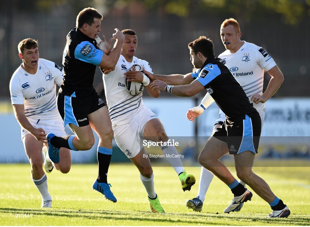 6 September 2014; Zane Kirchner, Leinster, is tackled by Mark Bennett, left, and Tommy Seymour, right, Glasgow Warriors. Guinness PRO12, Round 1, Glasgow Warriors v Leinster. Scotstoun Stadium, Glasgow, Scotland. Picture credit: Stephen McCarthy / SPORTSFILE