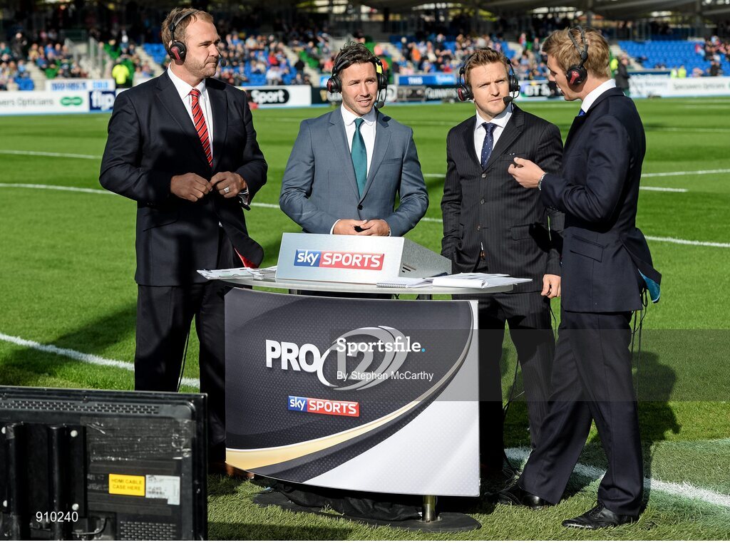 6 September 2014; Sky Sports presenter Alex Payne, right, with analysts, from left, Scott Quinnell, Paddy Wallace and Rory Lawson. Guinness PRO12, Round 1, Glasgow Warriors v Leinster. Scotstoun Stadium, Glasgow, Scotland. Picture credit: Stephen McCarthy / SPORTSFILE