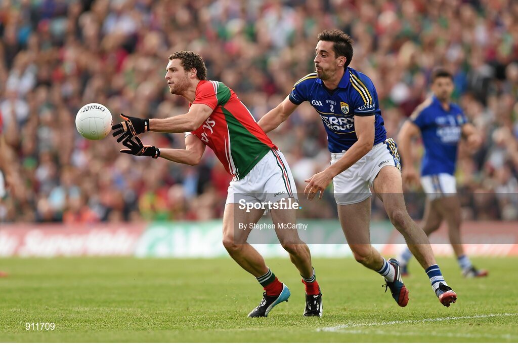 30 August 2014; Tom Parsons, Mayo, in action against Anthony Maher, Kerry. GAA Football All Ireland Senior Championship, Semi-Final Replay, Kerry v Mayo. Gaelic Grounds, Limerick. Picture credit: Stephen McCarthy / SPORTSFILE