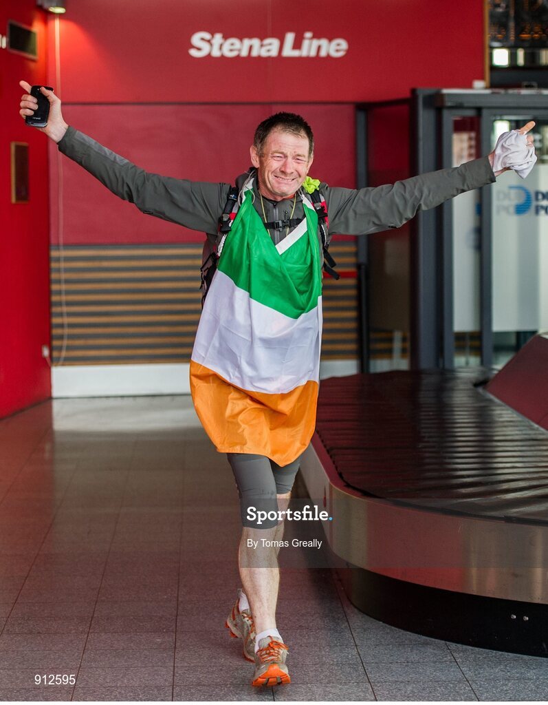 13 September 2014: Tony Mangan at Dublin Port on his arrival home to his native city after completing a four year ‘Around the World’ running odyssey- the only Irish man to ‘Run the World’. Tony will now run a 1,600 kilometre loop around Ireland, before finishing his Run the World trip when running in the SSE Airtricity Dublin Marathon on October Bank 27th. When he finishes the Dublin Marathon, he will have completed 50,000KM. Dublin Port, North Wall, Dublin. Picture Credit: Tomás Greally / SPORTSFILE