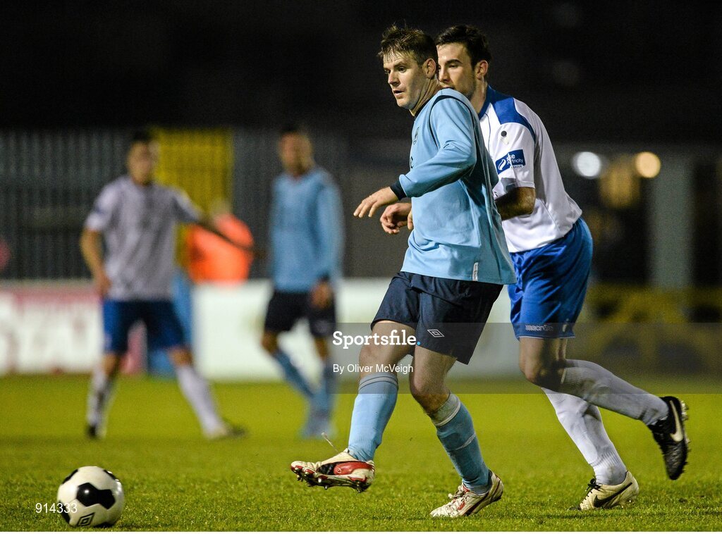 17 September 2014; Dave Warren, Avondale United, in action against Michael Funston, Finn Harps. FAI Ford Cup Quarter-Final Replay, Finn Harps v Avondale United. Finn Park, Ballybofey, Co. Donegal. Picture credit: Oliver McVeigh / SPORTSFILE