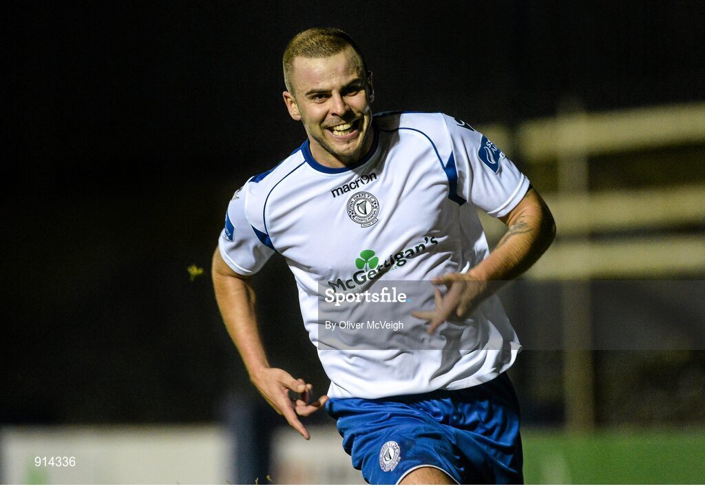 17 September 2014; Damien McNulty, Finn Harps, celebrates after scoring his side's second goal. FAI Ford Cup Quarter-Final Replay, Finn Harps v Avondale United. Finn Park, Ballybofey, Co. Donegal. Picture credit: Oliver McVeigh / SPORTSFILE