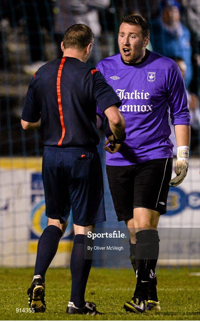 17 September 2014; Avondale United goalkeeper Danny O'Leary remonstrates with referee Ray Matthews after he was shown a red card in the second half. FAI Ford Cup Quarter-Final Replay, Finn Harps v Avondale United. Finn Park, Ballybofey, Co. Donegal. Picture credit: Oliver McVeigh / SPORTSFILE
