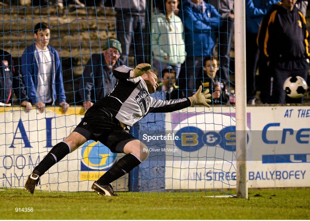 17 September 2014; Avondale United manager and substitute goalkeeper David O'Keefe fails to keep out the penatly from Kevin McHugh, Finn Harps. O'Keefe replaced first choice goalkeeper Danny O'Leary after he received a red card from referee Ray Matthews, resulting in the penalty. FAI Ford Cup Quarter-Final Replay, Finn Harps v Avondale United. Finn Park, Ballybofey, Co. Donegal. Picture credit: Oliver McVeigh / SPORTSFILE