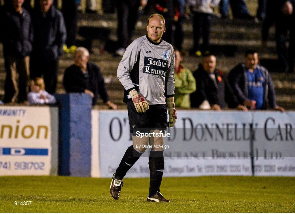 17 September 2014; Avondale United manager and substitute goalkeeper David O'Keefe reacts after failing keep out the penatly from Kevin McHugh, Finn Harps. O'Keefe replaced first choice goalkeeper Danny O'Leary after he received a red card from referee Ray Matthews, resulting in the penalty. FAI Ford Cup Quarter-Final Replay, Finn Harps v Avondale United. Finn Park, Ballybofey, Co. Donegal. Picture credit: Oliver McVeigh / SPORTSFILE