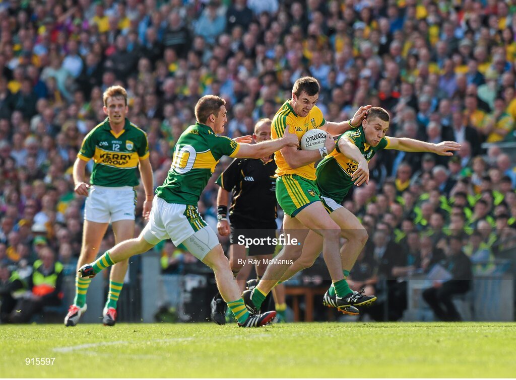 21 September 2014; Leo McLoone, Donegal, in action against Stephen O'Brien, left, and Peter Crowley, Kerry. GAA Football All Ireland Senior Championship Final, Kerry v Donegal. Croke Park, Dublin. Picture credit: Ray McManus / SPORTSFILE