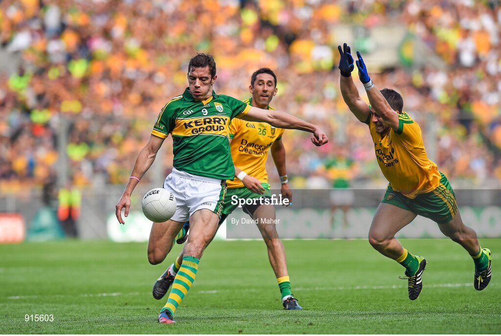21 September 2014; David Moran, Kerry, in action against Paddy McGrath, right, Donegal. GAA Football All Ireland Senior Championship Final, Kerry v Donegal. Croke Park, Dublin. Picture credit: David Maher / SPORTSFILE