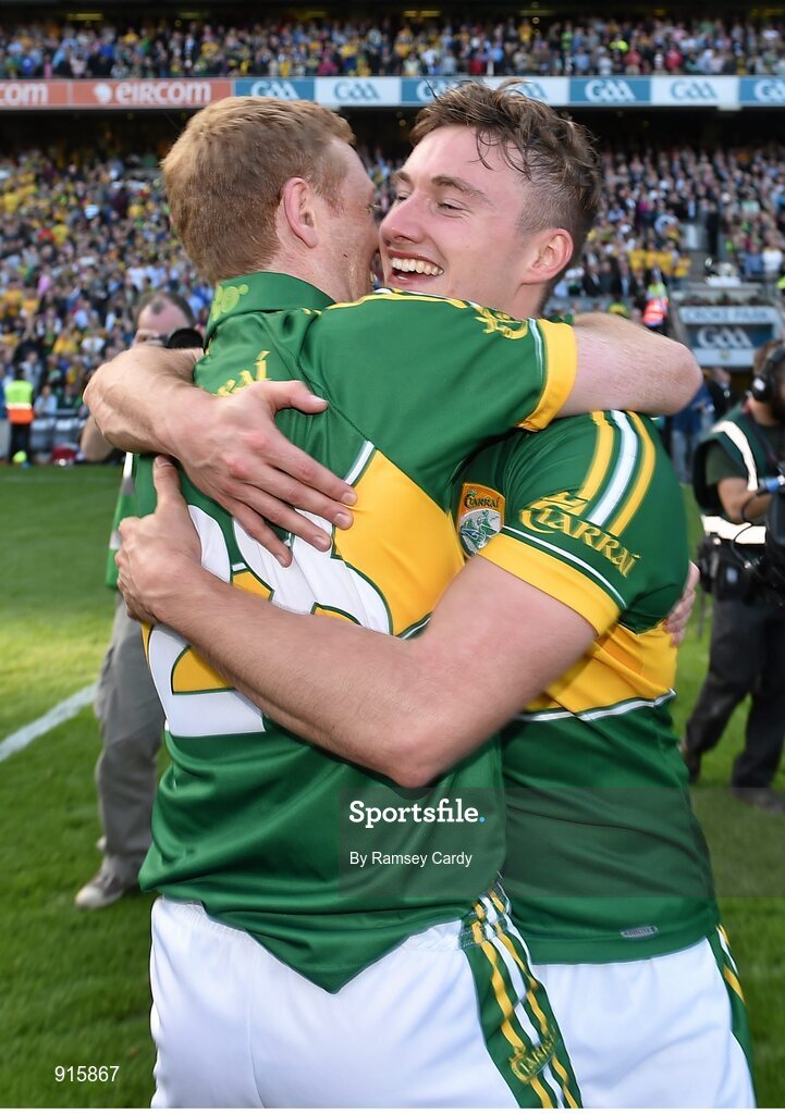 21 September 2014; Kerry's James O'Donoghue, left, and Colm Cooper celebrate at the final whistle. GAA Football All Ireland Senior Championship Final, Kerry v Donegal. Croke Park, Dublin. Picture credit: Ramsey Cardy / SPORTSFILE