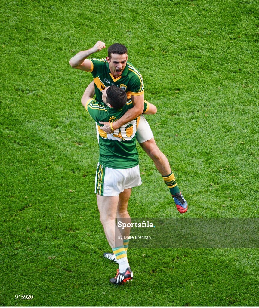 21 September 2014; Bryan Sheehan, Kerry, below, and Shane Enright, celebrate at the end of the game. GAA Football All Ireland Senior Championship Final, Kerry v Donegal. Croke Park, Dublin. Picture credit: Dáire Brennan / SPORTSFILE