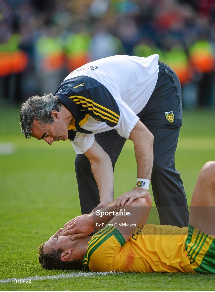 21 September 2014; Donegal manager Jim McGuinness consoles his captain Michael Murphy after the game. GAA Football All Ireland Senior Championship Final, Kerry v Donegal. Croke Park, Dublin. Picture credit: Piaras Ó Mídheach / SPORTSFILE