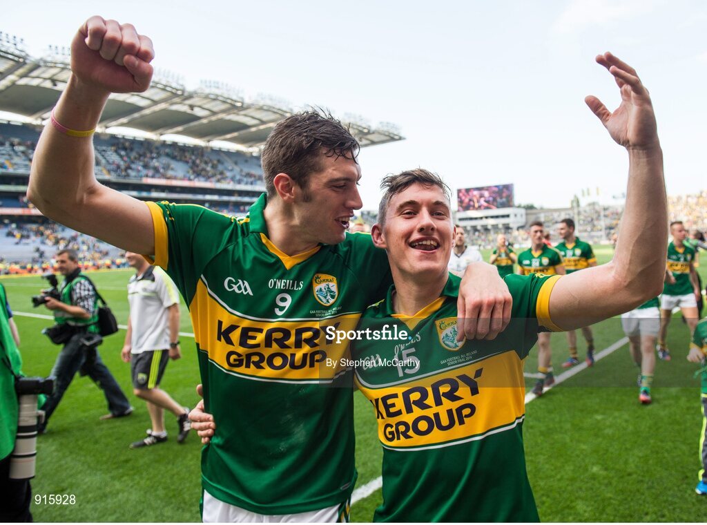 21 September 2014; Kerry's David Moran, left, and James O'Donoghue celebrate their side's victory. GAA Football All Ireland Senior Championship Final, Kerry v Donegal. Croke Park, Dublin. Picture credit: Stephen McCarthy / SPORTSFILE