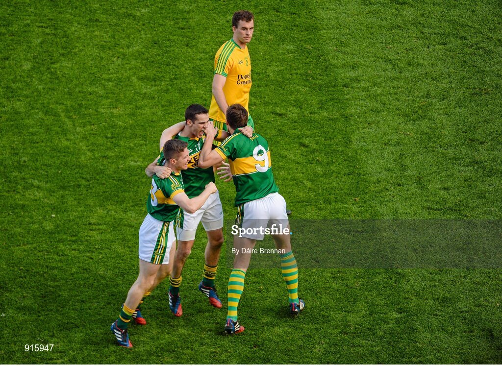 21 September 2014; Kerry players, left to right, Kieran O'Leary, Shane Enright, and David Moran celebrate as Éamonn McGee, Donegal walks off dejectedly. GAA Football All Ireland Senior Championship Final, Kerry v Donegal. Croke Park, Dublin. Picture credit: Dáire Brennan / SPORTSFILE