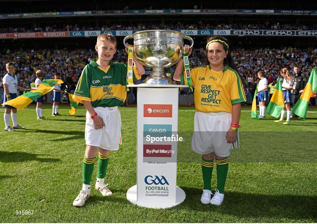21 September 2014; Brian Quinlan, Aghatubrid NS, Co. Kerry, left, and Aimee Boyle, St. Conal's NS, Kilclooney, Co. Donegal, carry the Sam Maguire cup on to the pitch before the game. GAA Football All Ireland Senior Championship Final, Kerry v Donegal. Croke Park, Dublin. Picture credit: Pat Murphy / SPORTSFILE