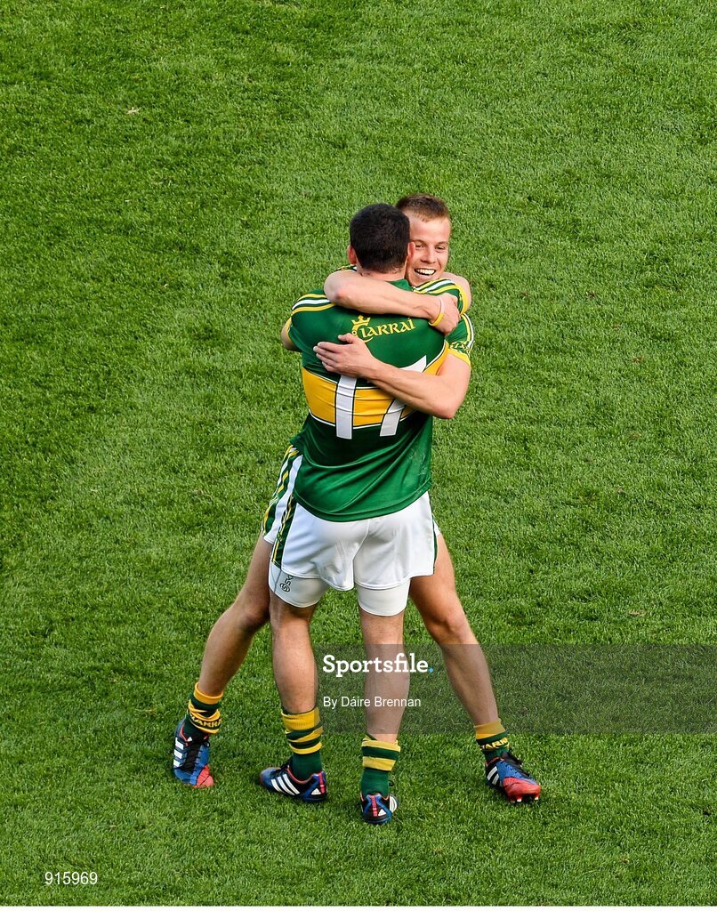 21 September 2014; Shane Enright, left, and Fionn Fitzgerald, Kerry, celebrate at the end of the game. GAA Football All Ireland Senior Championship Final, Kerry v Donegal. Croke Park, Dublin. Picture credit: Dáire Brennan / SPORTSFILE