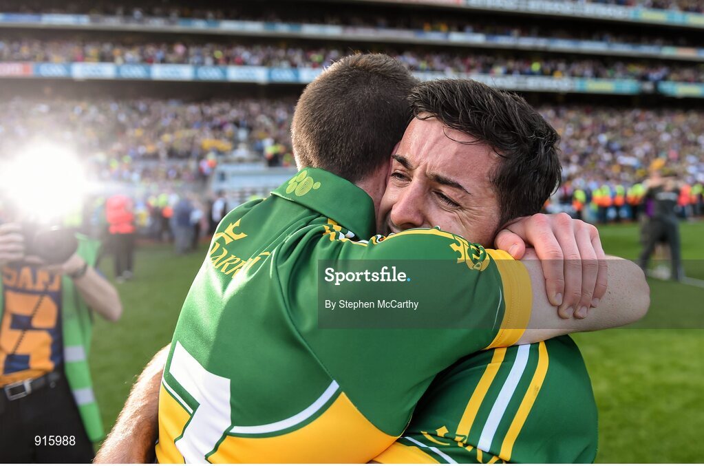 21 September 2014; Kerry's Aidan O'Mahony, right, and Paul Geaney celebrate their side's victory. GAA Football All Ireland Senior Championship Final, Kerry v Donegal. Croke Park, Dublin. Picture credit: Stephen McCarthy / SPORTSFILE