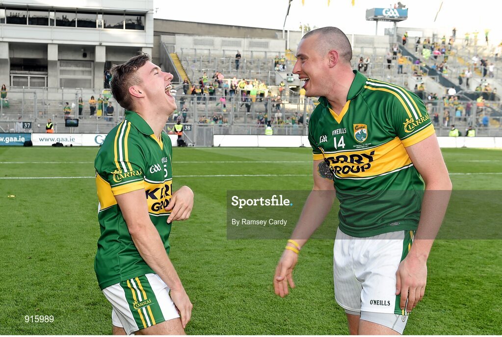 21 September 2014; Kerry's James O'Donoghue, left, and Kieran Donaghy share a joke after the game. GAA Football All Ireland Senior Championship Final, Kerry v Donegal. Croke Park, Dublin. Picture credit: Ramsey Cardy / SPORTSFILE